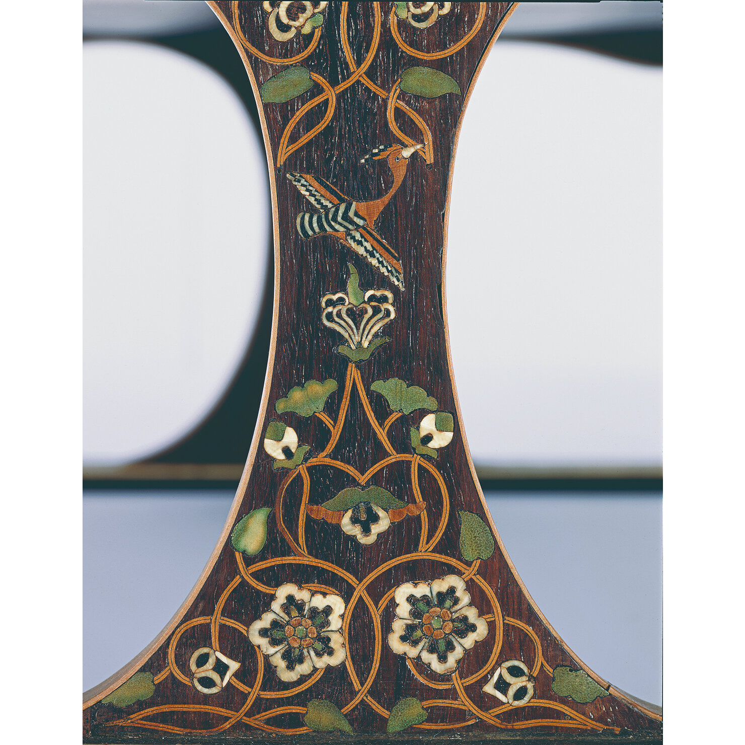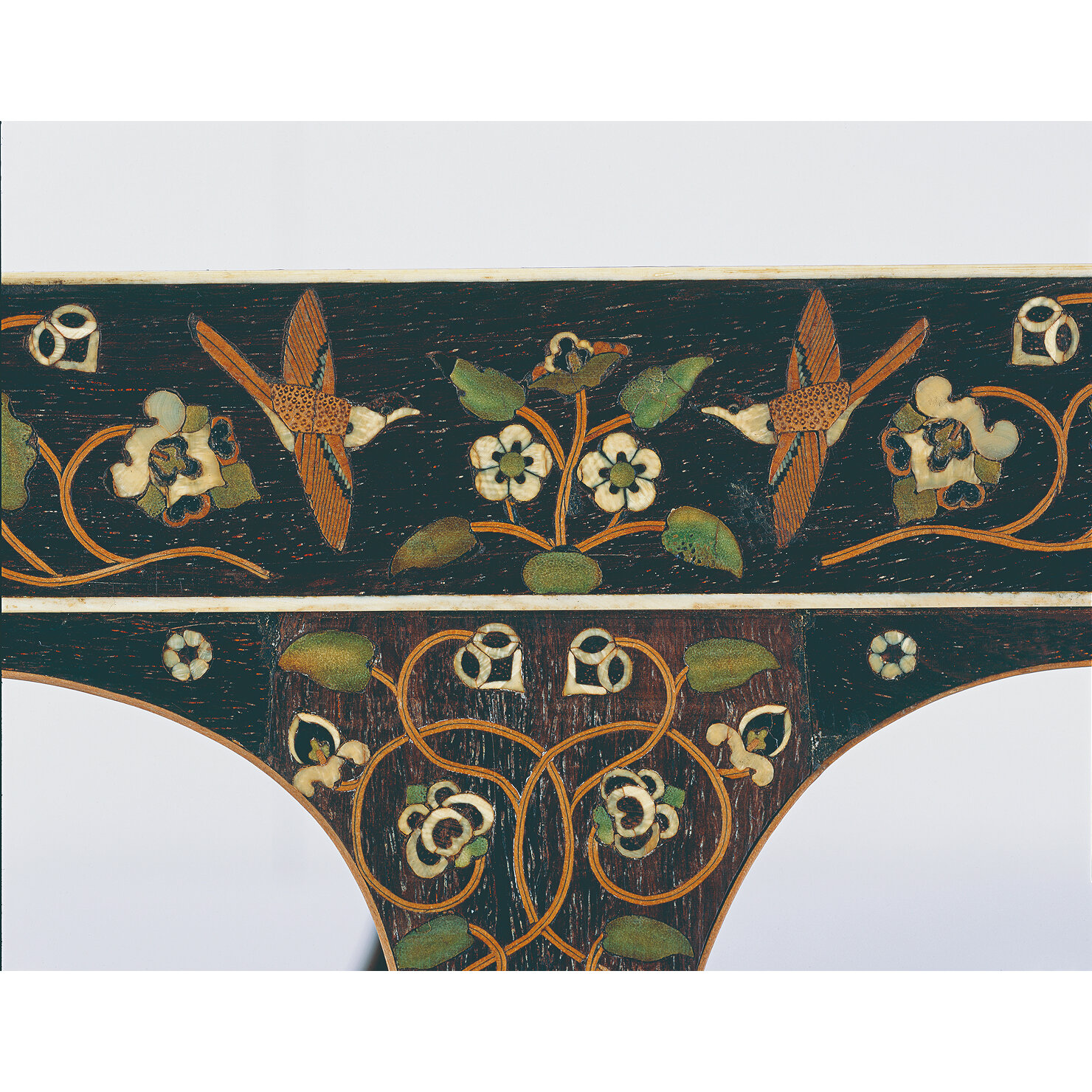 | 解説 | 『国家珍宝帳(こっかちんぽうちょう)』に記載された聖武天皇(しょうむてんのう)ご愛用の双六盤。四周に立ち上がりをつけた盤面に床脚(しょうきゃく)が付く姿である。木胎の上から外来のシタンの薄板を貼って作られており、表面には木画(もくが)という寄木細工の技法で鳥や唐草の装飾文様が凝らされる。木画はツゲ、シタン、コクタン、象牙、鹿角、竹といった多彩な素材を用い、個々のモティーフを彩りゆたかに、かつ生き生きと表現している。高貴な素材と高度な技術が結実した、天皇ゆかりにふさわしい品格を誇る宝物である。 |